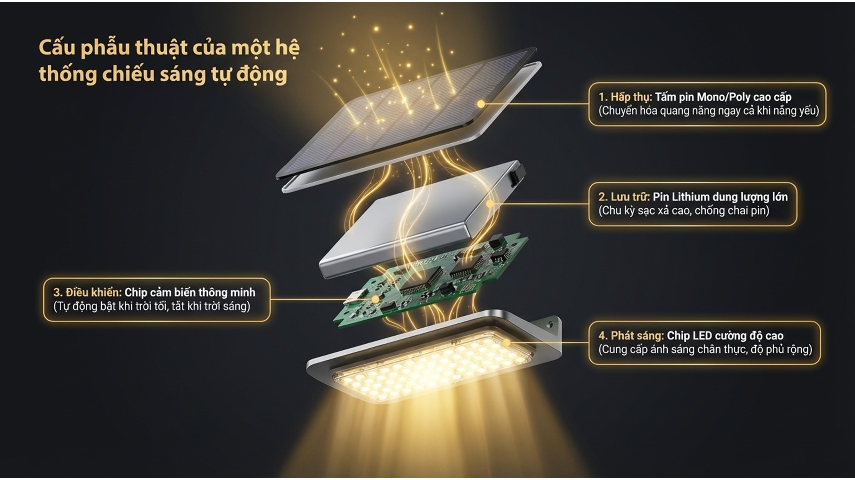 Ban ngày: tấm pin hấp thụ ánh nắng, lưu trữ vào pin