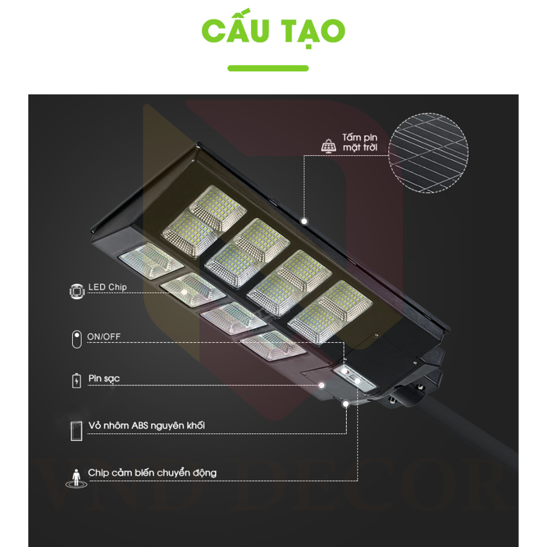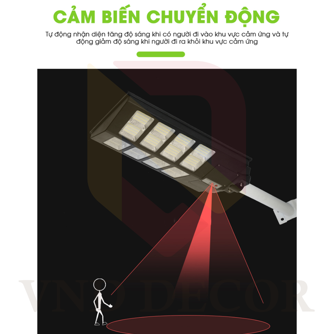 - Đèn đường năng lượng mặt trời liền thể 300W được trang bị cảm biến chuyển động trên thân đèn giúp nhận diện có người đến gần và đồng thời tăng độ sáng khi người bước đến và giảm độ sáng khi người ra khỏi khu vực lắp đặt đèn NLMT. Điều này giúp đèn đường 300W tiết kiệm năng lượng tối đa và vẫn có thể phục vụ tốt cho người dùng.