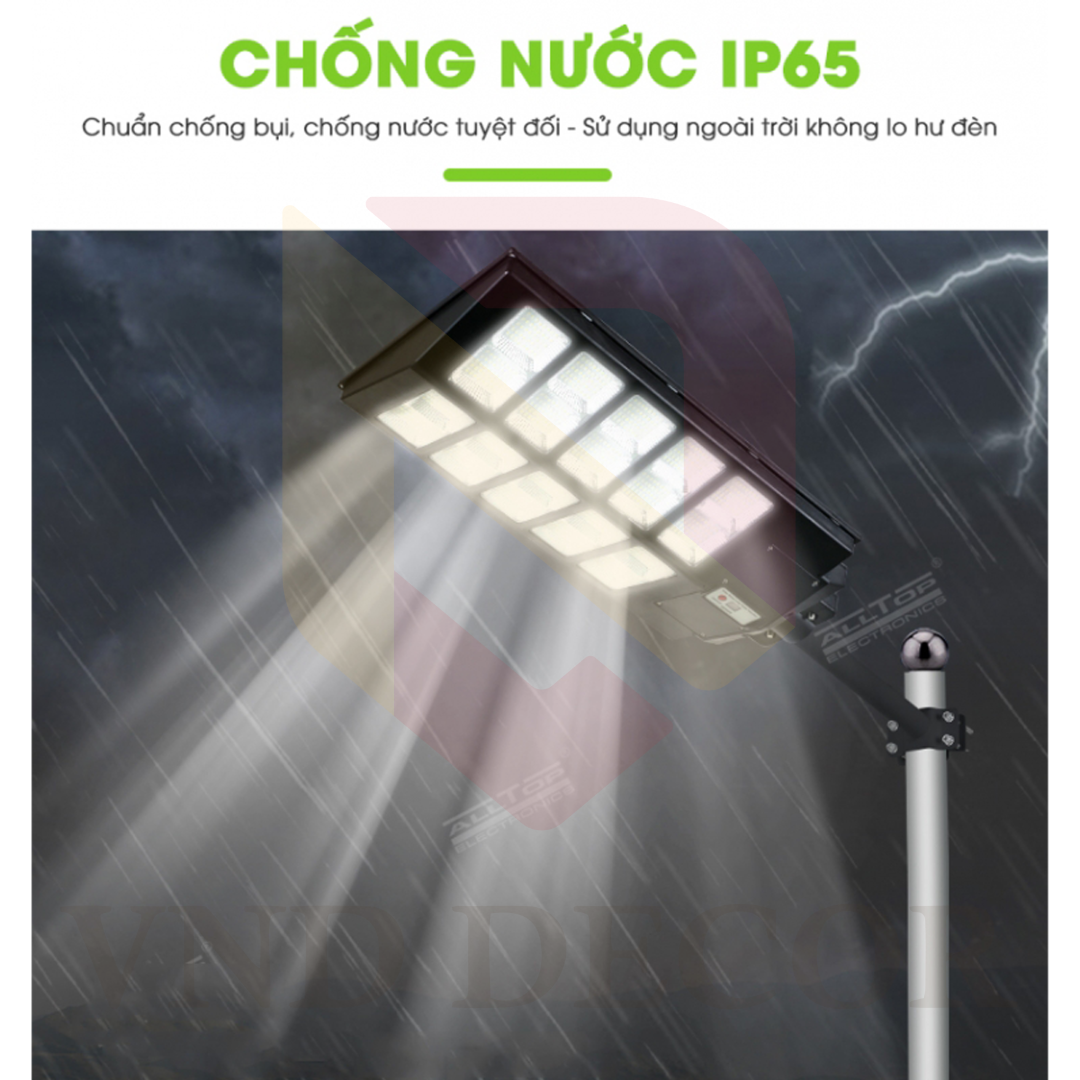 - Đèn đường năng lượng mặt trời liền thể 300W được sản xuất theo tiêu chuẩn IP65 với lớn vỏ bằng nhôm ABS nguyên khối giúp bảo vệ các bo mạch bên trong hiệu quả tránh các tác nhân gây hại từ môi trường ngoài trời như: mưa bão, nắng gắt, khói bụi,…