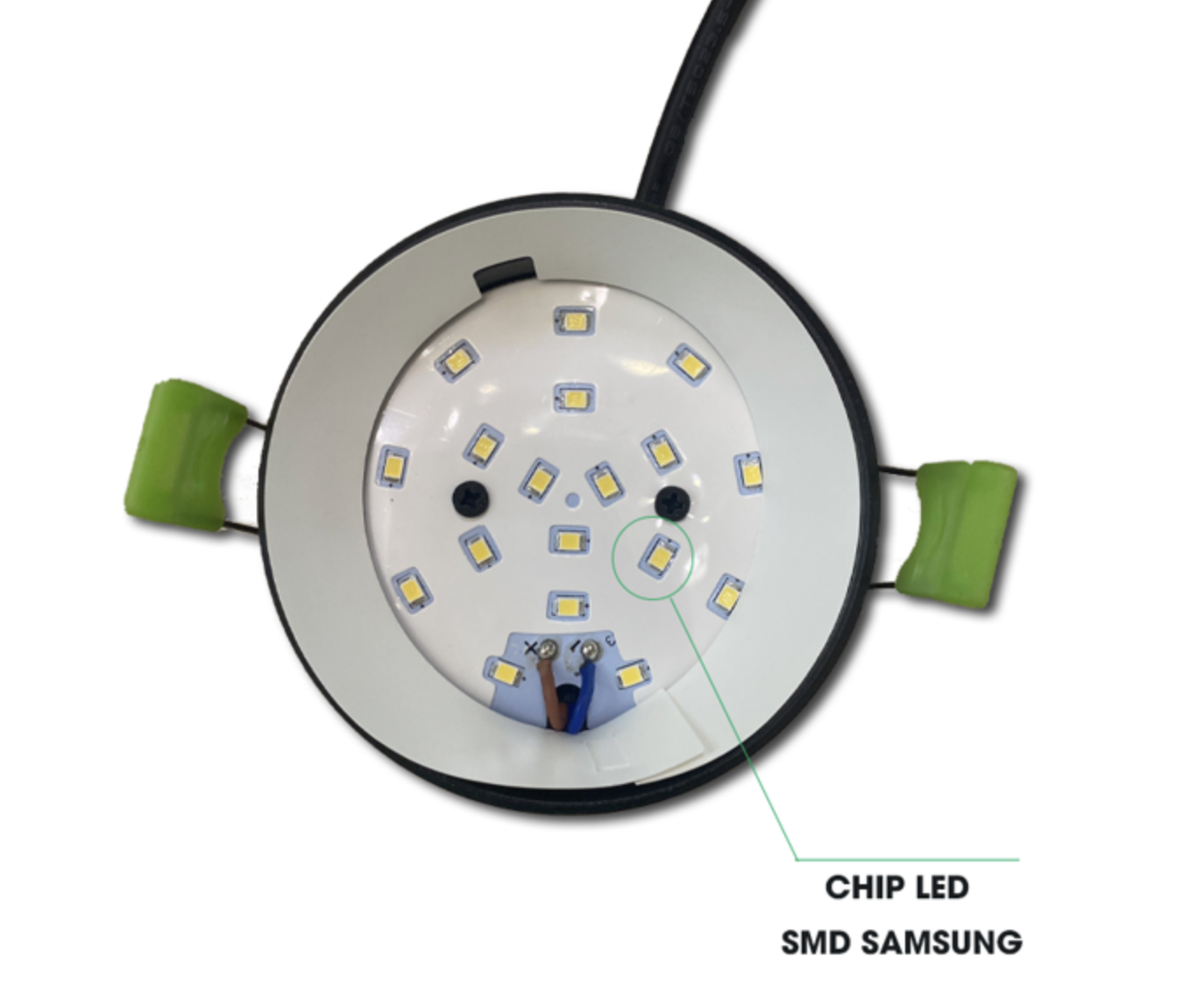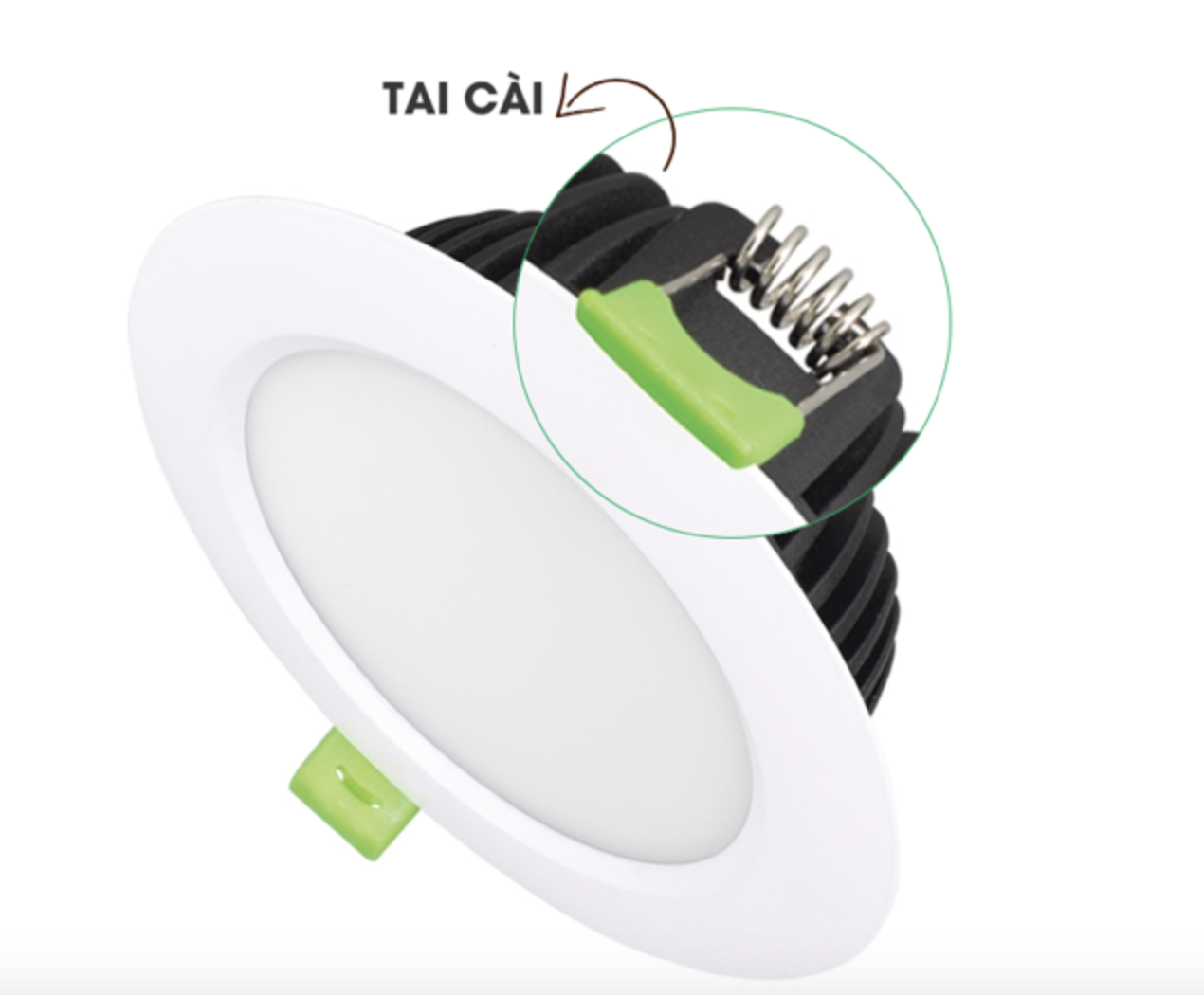 Phần tai cài điểm nhấn tay cầm màu xanh bằng nhựa, giúp nhận biết 2 tai cài cơ bản. Quan trọng là phần lò xo, lò xo có sự đàn hồi tốt, chắc chắn, bám trần và giữ đèn cố định tại 1 chỗ, ít bị xê dịch hay bị bung ra. Do đó, bạn yên tâm khi lựa chọn các mẫu đèn led âm trần mà VND DECOR phân phối.