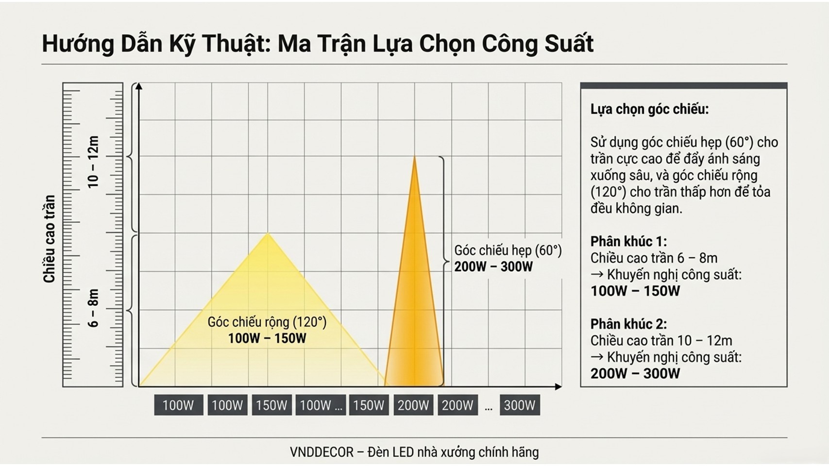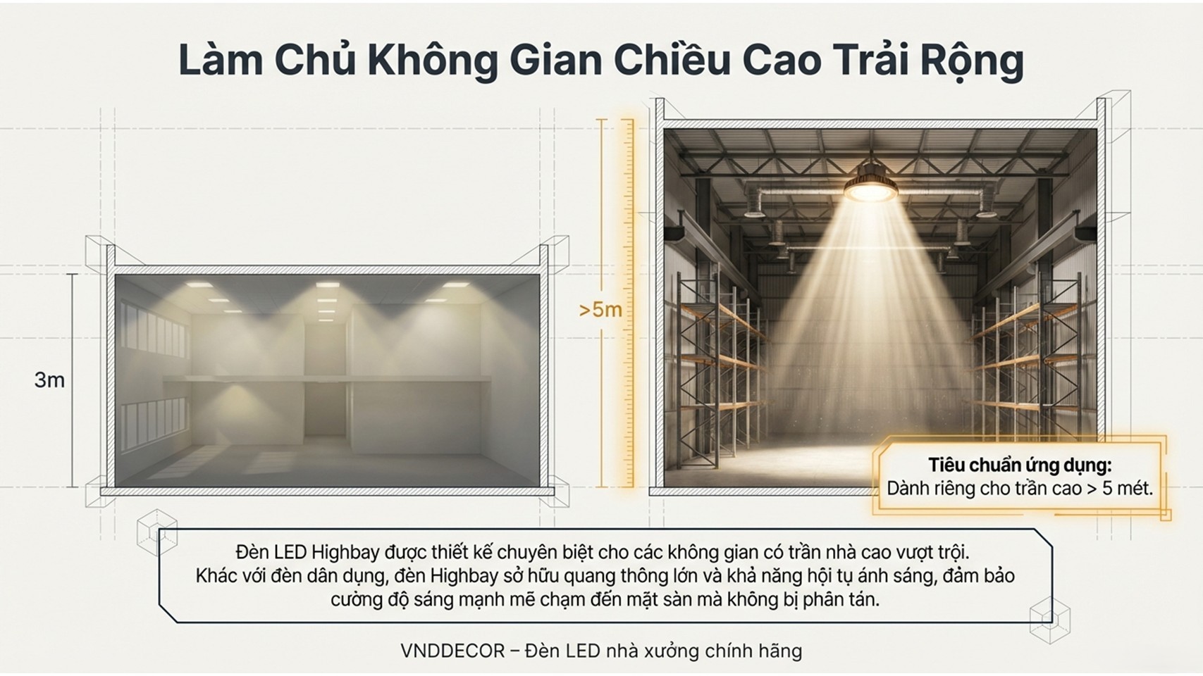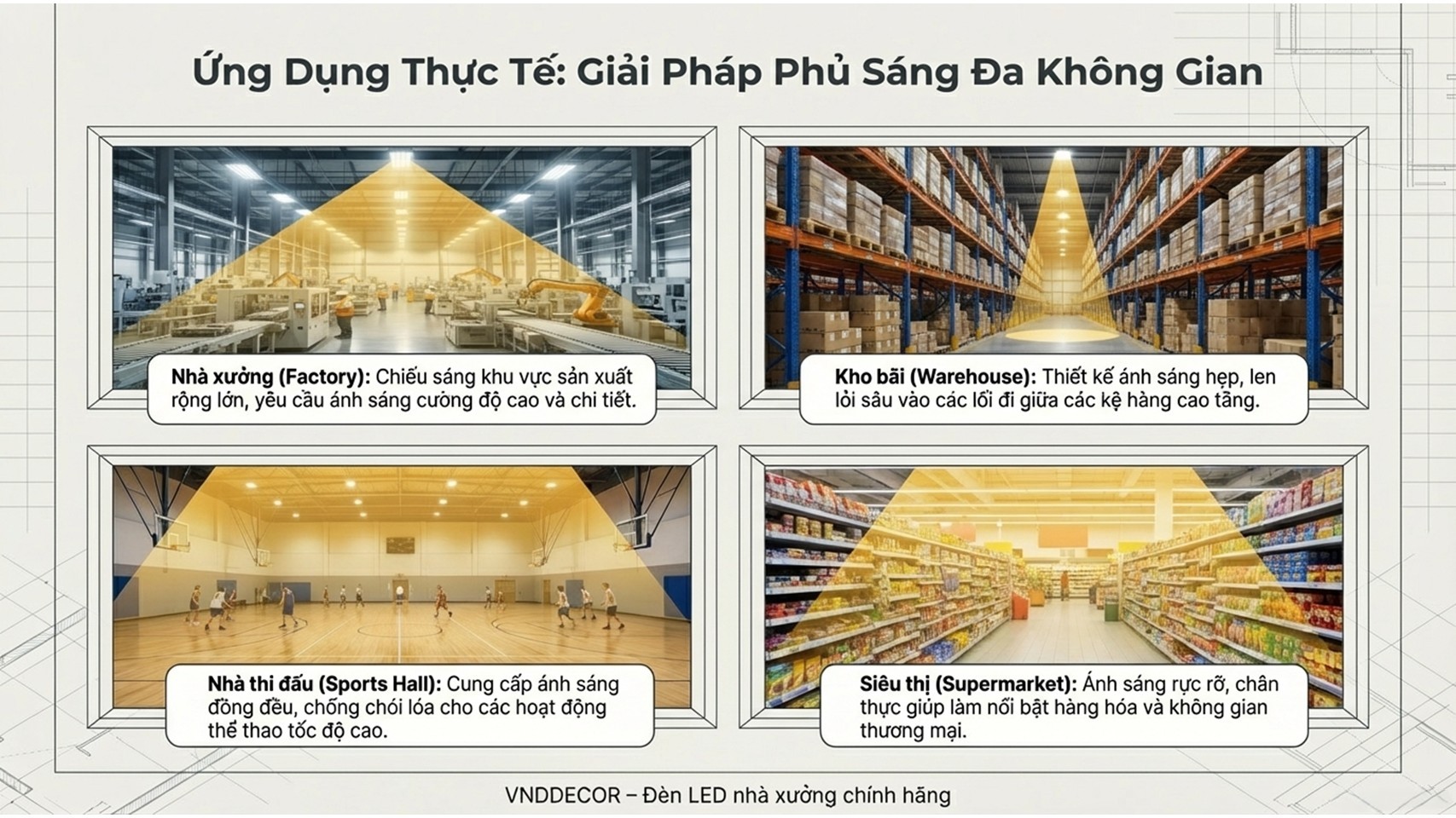 | Lắp đặt treo cao (>5m): | Phù hợp với nhà xưởng, nhà kho, nhà thi đấu |