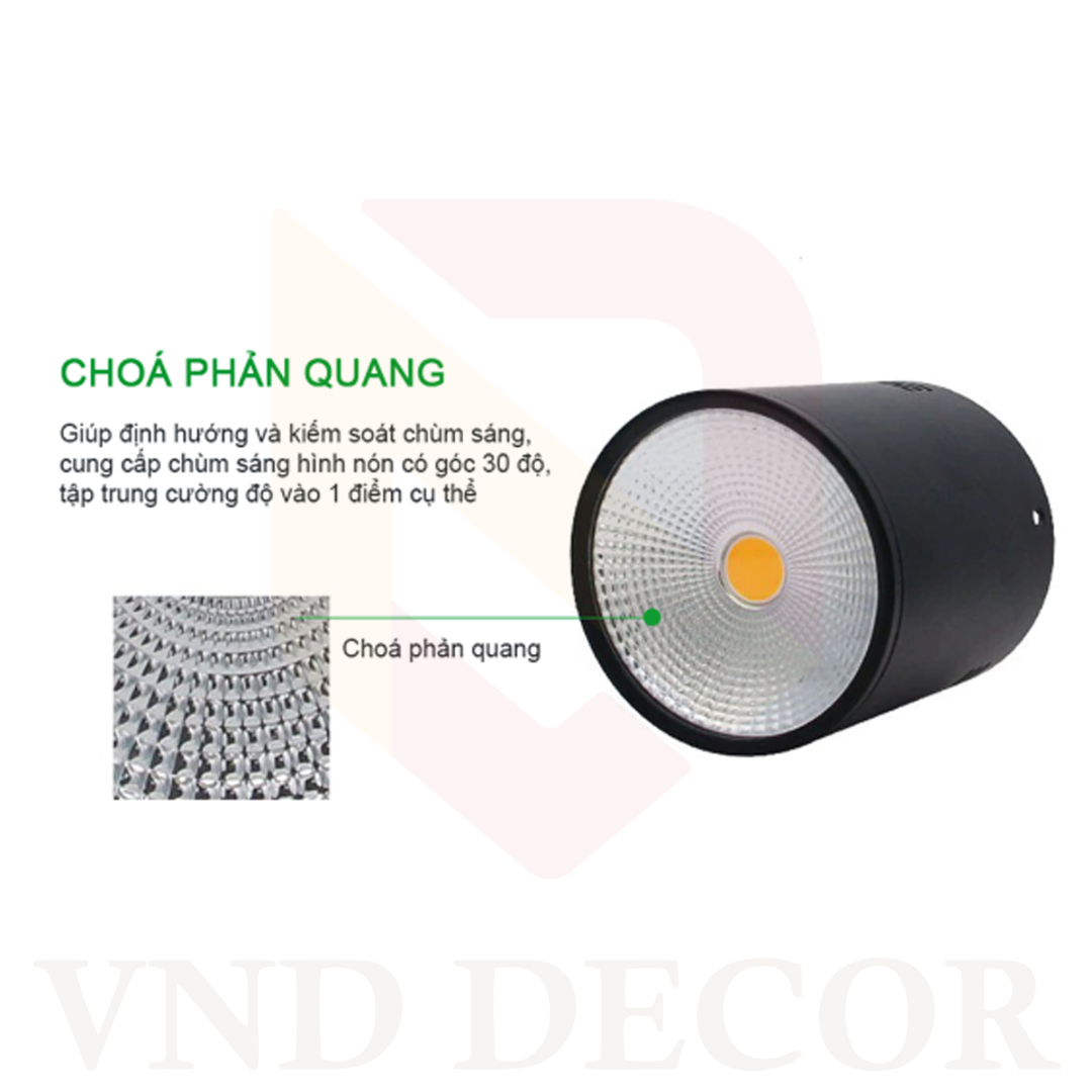 Chóa phản quang giúp định hướng và kiểm soát chùm tia sáng. Cung cấp chùm sáng hình nón có góc chiếu nhỏ 30 độ, giúp tia sáng tâp trung cường độ vào 1 khu vực cụ thể và làm nổi bật chúng trong không gian.
