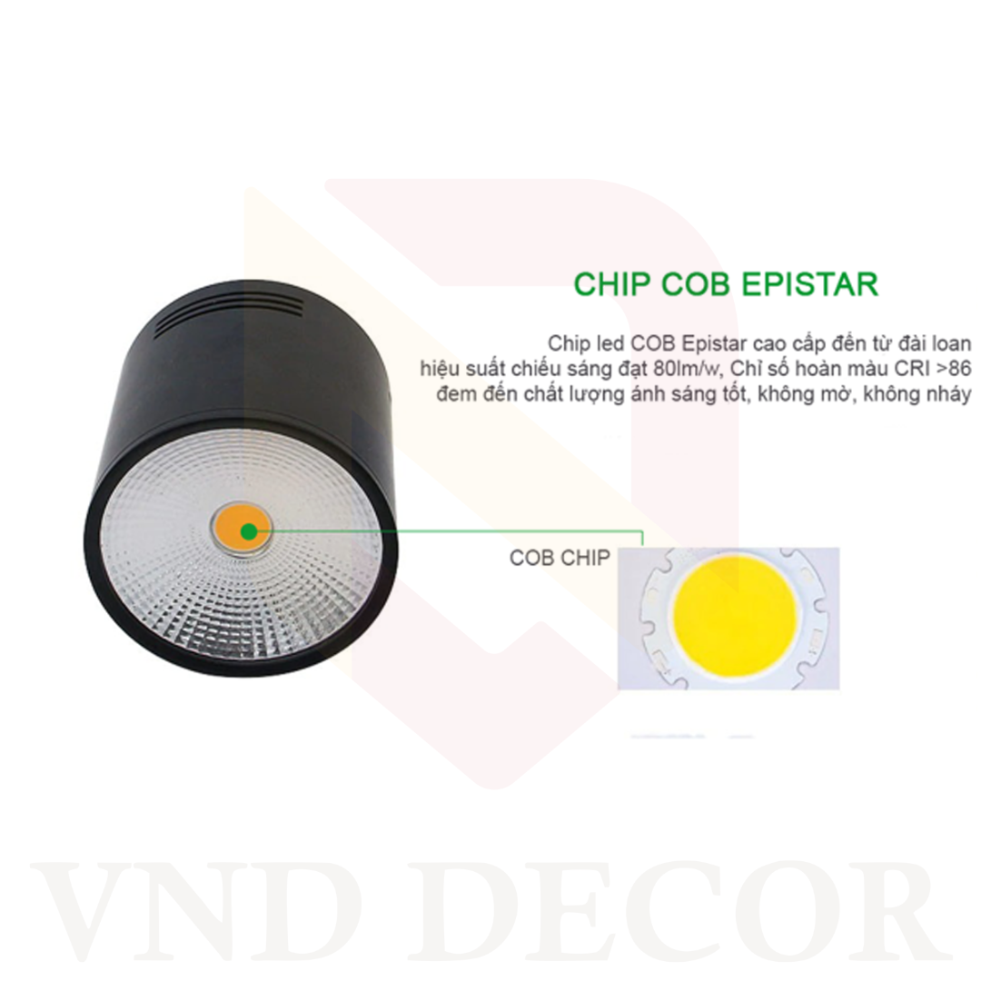 Chip led COB Epistar cao cấp đến từ đài loan hiệu suất chiếu sáng đạt 100lm/w, Chỉ số hoàn màu CRI >86 đem đến chất lượng ánh sáng tốt, không mờ, không nháy.