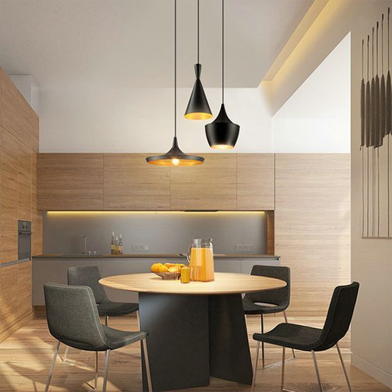 Đèn thả trần là lựa chọn tối ưu để chiếu sáng toàn bộ không gian ăn một cách đều đặn. Chọn mẫu đèn thả trần phù hợp với diện tích và kiến trúc của căn phòng. Sự kết hợp hài hòa giữa đèn thả trần và đèn bàn ăn sẽ tạo nên một không gian ăn rộng lớn và thoáng đãng.