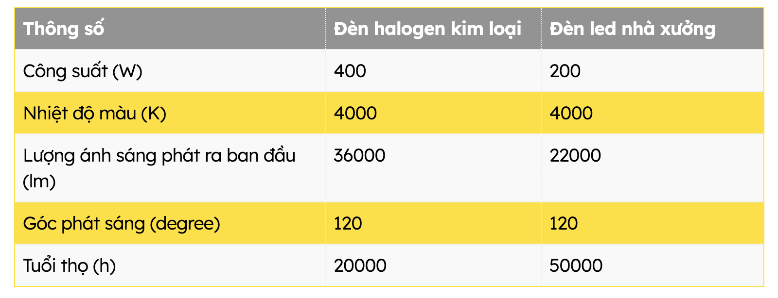 - Sau 10.000 giờ sử dụng: Lượng ánh sáng của đèn halogen kim loại chỉ tương đương với lượng ánh sáng phát ra của đèn LED nhà xưởng 100W.