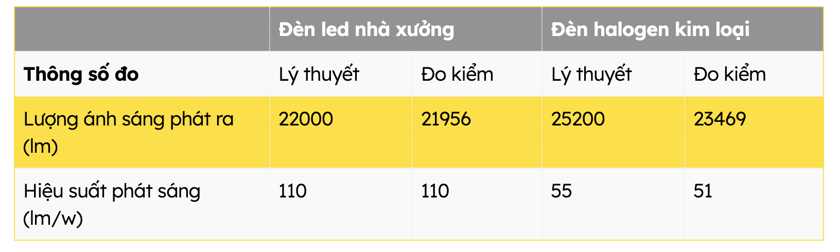 - Đèn LED nhà xưởng: 21,780 lm / 200W = 108.9 lm/W.
