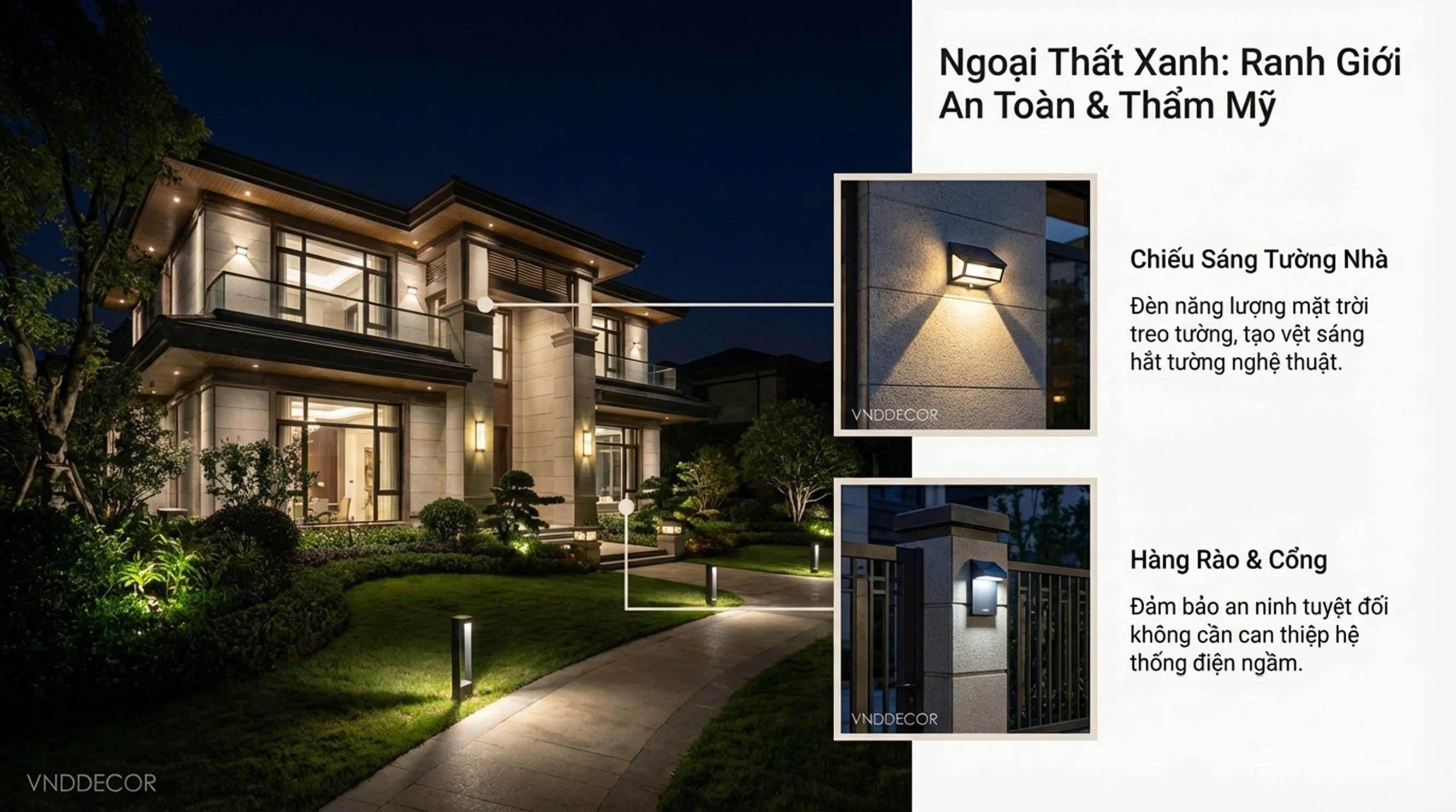 Ngoài ra, đèn năng lượng mặt trời cũng trở thành lựa chọn lý tưởng cho những khu vực ngoài trời như sân vườn, cổng nhà, bãi xe hoặc đường đi nhờ khả năng hoạt động hoàn toàn bằng năng lượng tự nhiên.